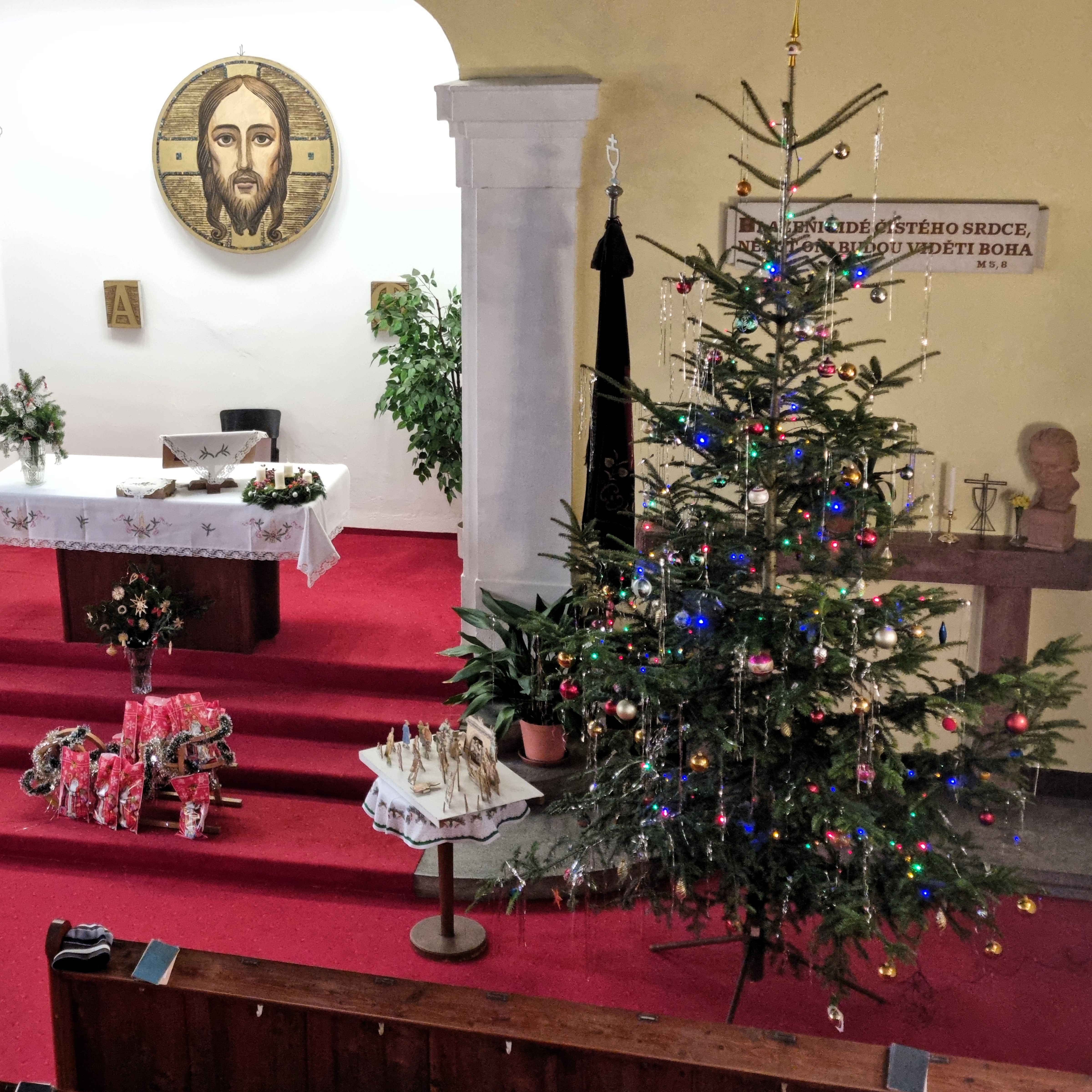 Betlém v heřmanickém Husově sboru vznikl v dílně našeho člena a je vytvořen technikou, která byla hojně využívána v 19. a 20. století. Jednotlivé postavy byly nejprve vystřiženy z papíru – často podle předloh Mikoláše Alše či Josefa Lady – poté nalepeny na překližku a s pečlivostí vyřezány lupénkovou pilkou. Výsledkem je citlivá práce plná tradice, trpělivosti a poctivého řemesla, která dodnes těší oko i srdce.