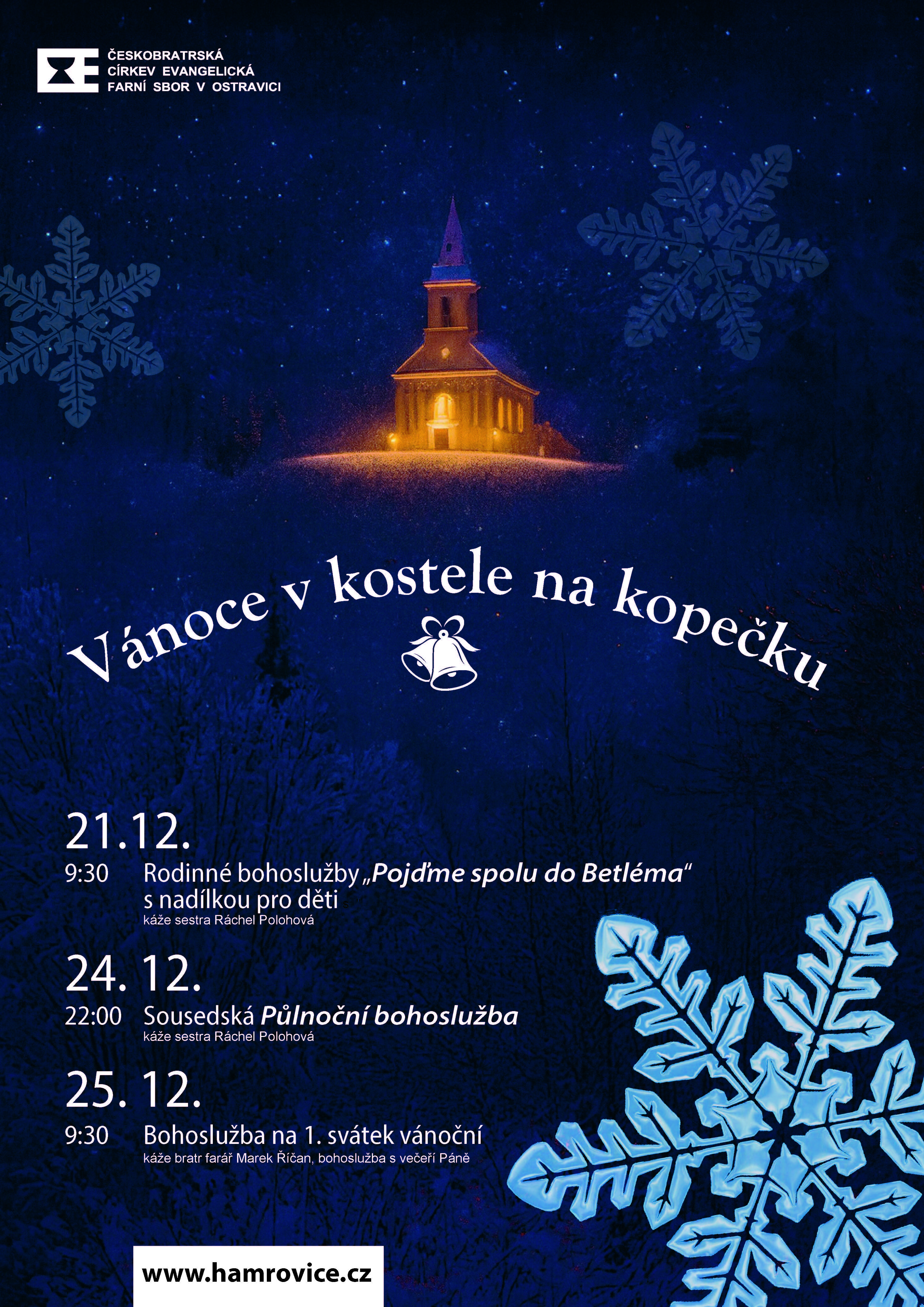 Pokojné a radostné prožití Adventu i vánočního období vám přeje staršovstvo ostravického sboru.V době Adventu a Vánoc zveme vás i vaše blízké na následující bohoslužebná shromáždění: